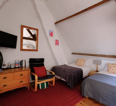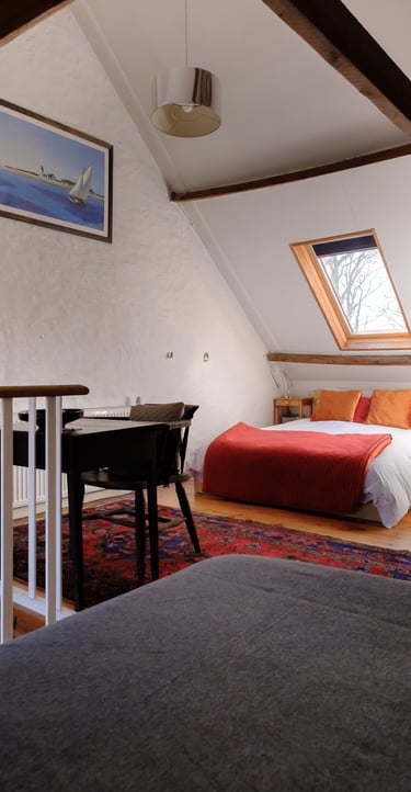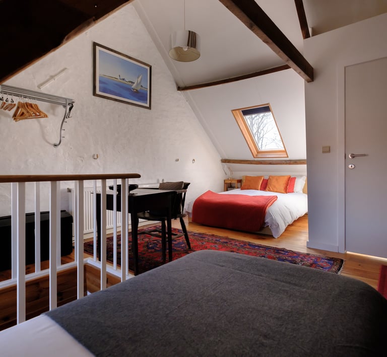 A charming attic suite featuring a comfortable double bed and two cozy single beds, ideal for friends or family looking to unwind and enjoy their time in Brugge.