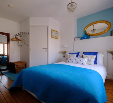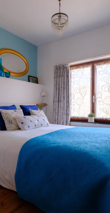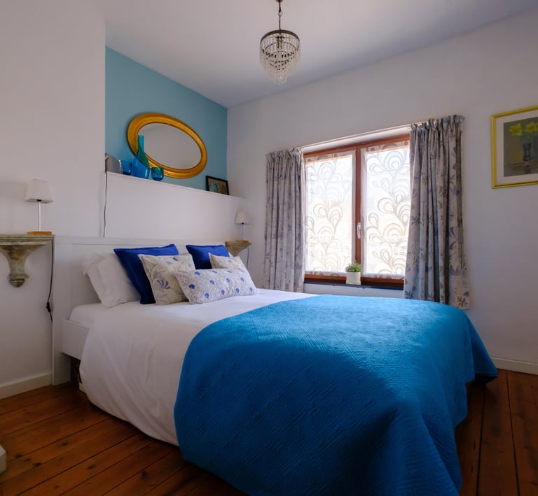 A double bed in a tranquil space are adorned with vibrant pops of color, creating a welcoming atmosphere perfect for visiting Brugge.